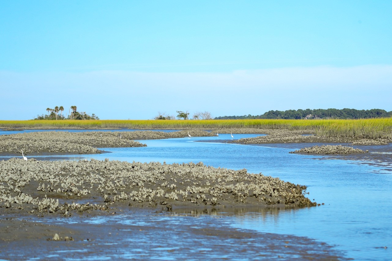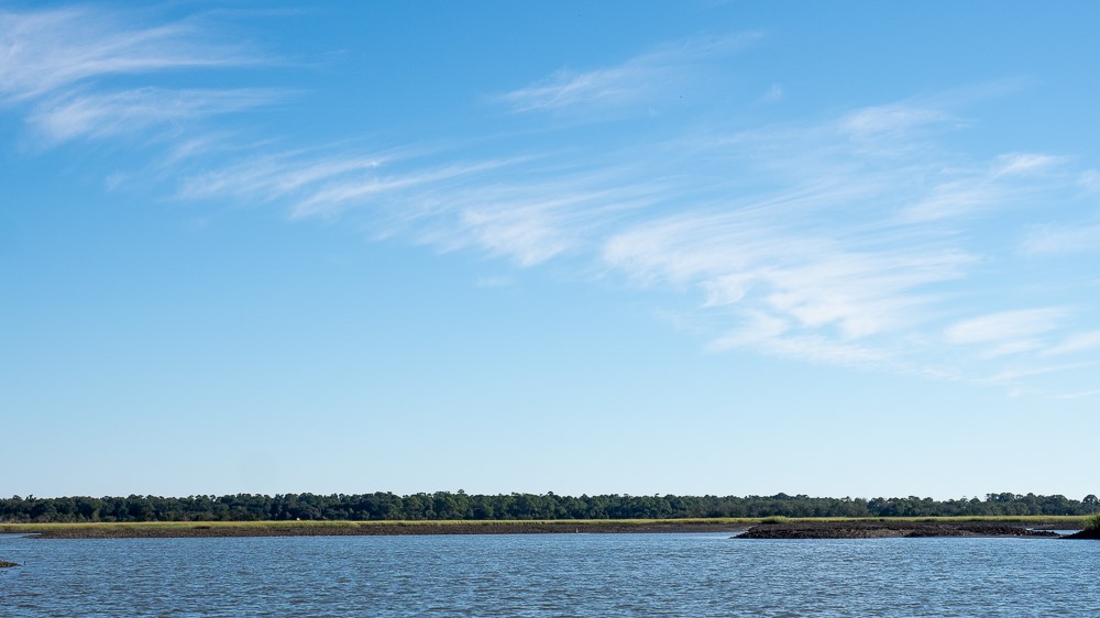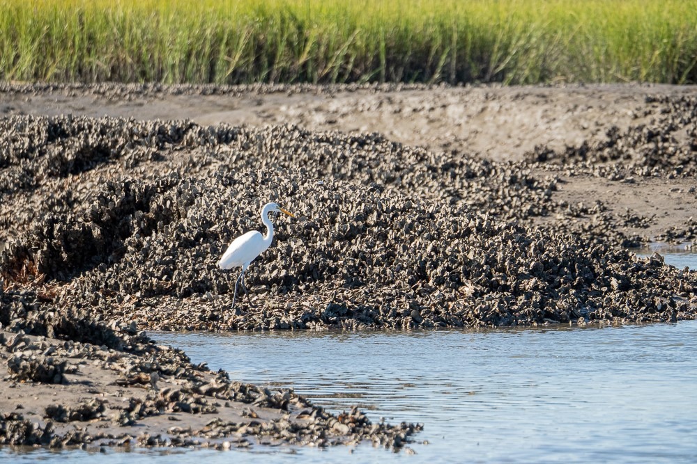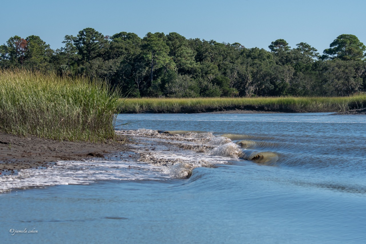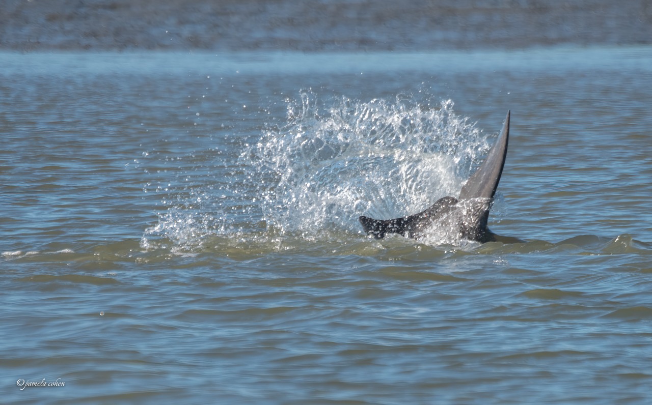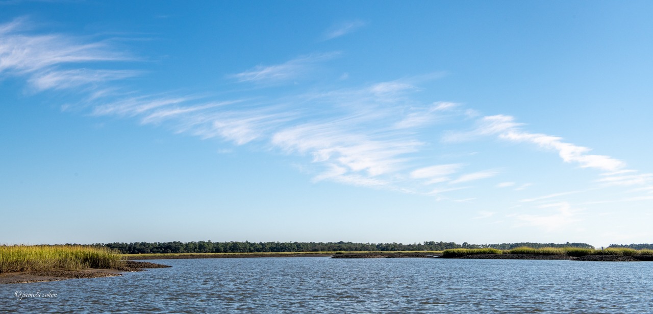 Participating club members were guided by Captain Brad Schmoll, who maneuvered the boat to the hotspots on the Kiawah River. We were all “armed” with photo gear in anticipation of documenting dolphin strand feeding, which according to Capt. Brad, had been vigorously occurring all week. We headed to Capt. Sam’s Spit where dolphins were splashing but not strand feeding. The experience had us highly motivated to photograph whatever compositions came our way. During the second half, we took a cruise to the mudflats. There, we were immersed into the quiet solitude of the marsh environment, and greeted by beautiful vistas as the low tide uncovered multiple oyster beds. A variety of large wading birds flying overhead in the bright cloudless sky tested our skills at flying bird photography. We headed back to the dock with memory cards full of images after a fun shoot with fellow club members.